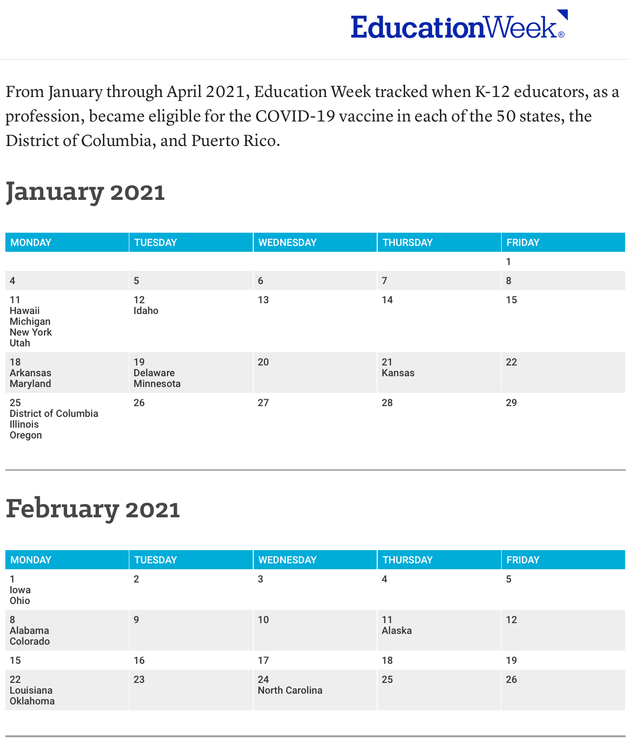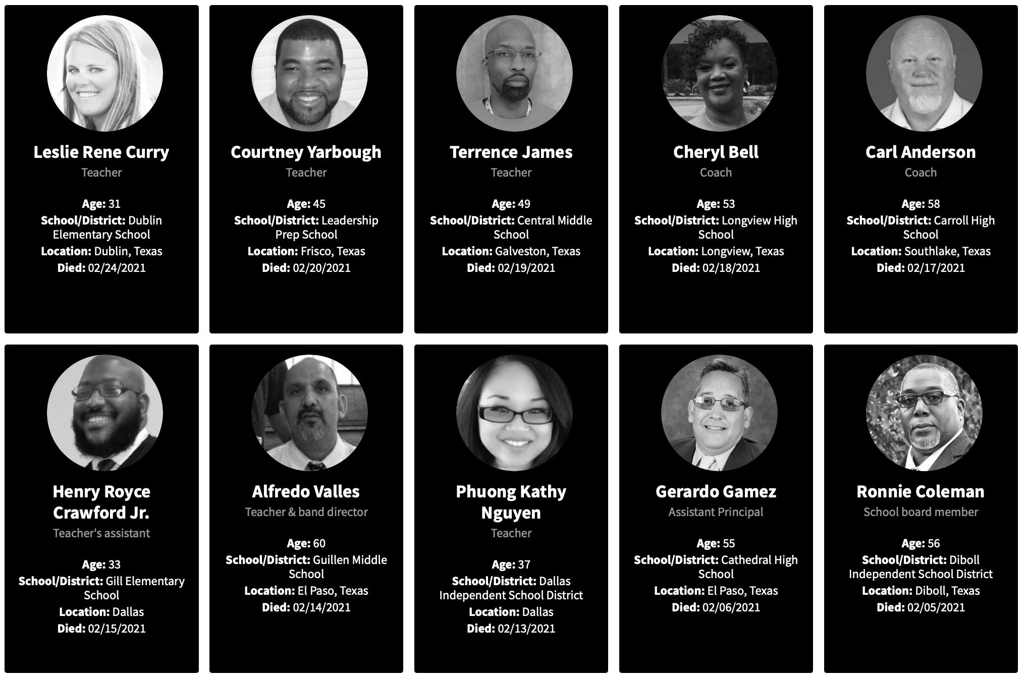 There are 73 people on that list, one of the largest state 2021 totals in the Education Week archive. As we found out in Georgia, the dates that vaccines were available for teachers varied from state to state. Texas did not officially let the educators line up for their shots until March 3, 2021. But like in Georgia, anxious Texas teachers could have crossed state lines to nearby locations with earlier vaccine availability:
