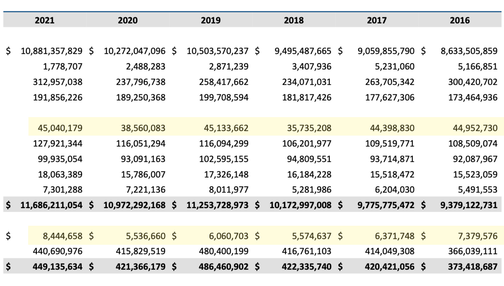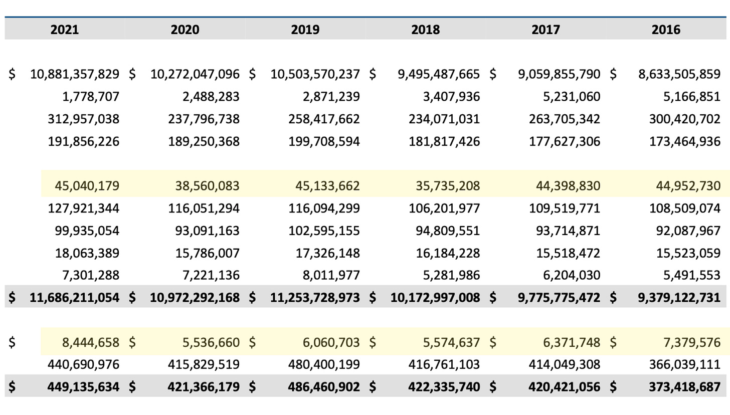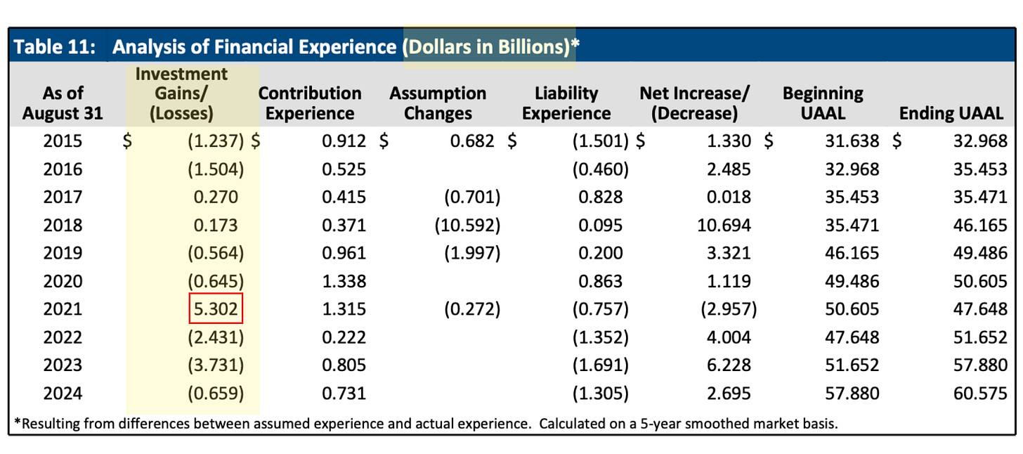 So here we again see the outlier number for investment gains in 2021, as we noticed in Georgia and Michigan. That is 5.3 billion dollars gained on the asset sheet. Almost every year prior or after were losses. The two that were not (2017 and 2018) were modest gains in comparison.