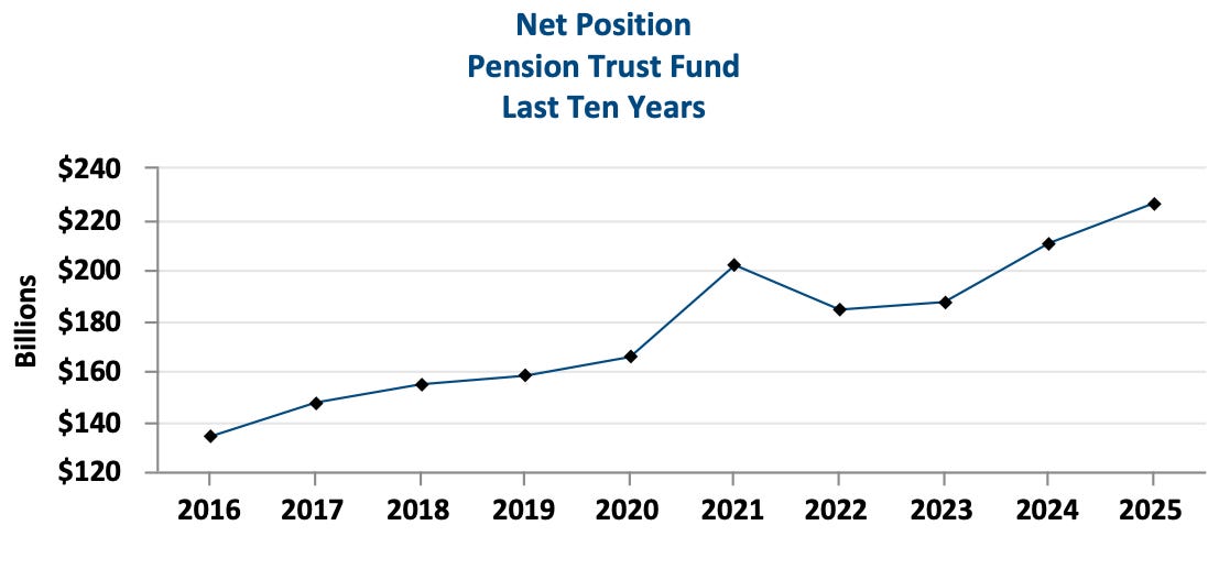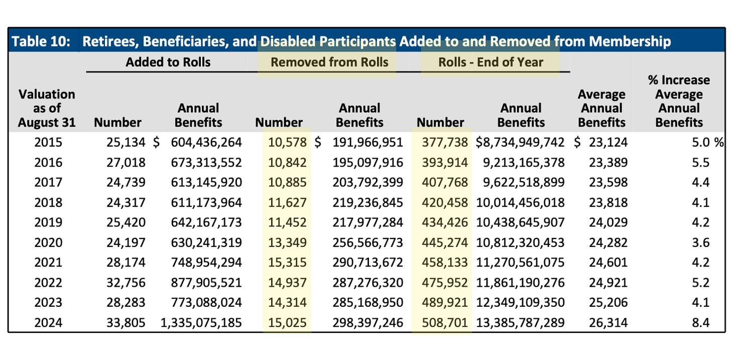 I do not normally find tidbits like this one early on in any of these documents, but these graphs are very illuminating. The one on the left is for retirees and other non-working members. The one on the right is for the active members. These are showing the membership numbers in this system’s health care coverage. 2021 saw an increase of members for the non-working folks, but it was a different story for the active (working) group. By my reckoning looking at that graph for the working people, over 25,000 members disappeared from 2021 to 2022. And then another 20,000 seems to have gone away from 2022 to 2023.
