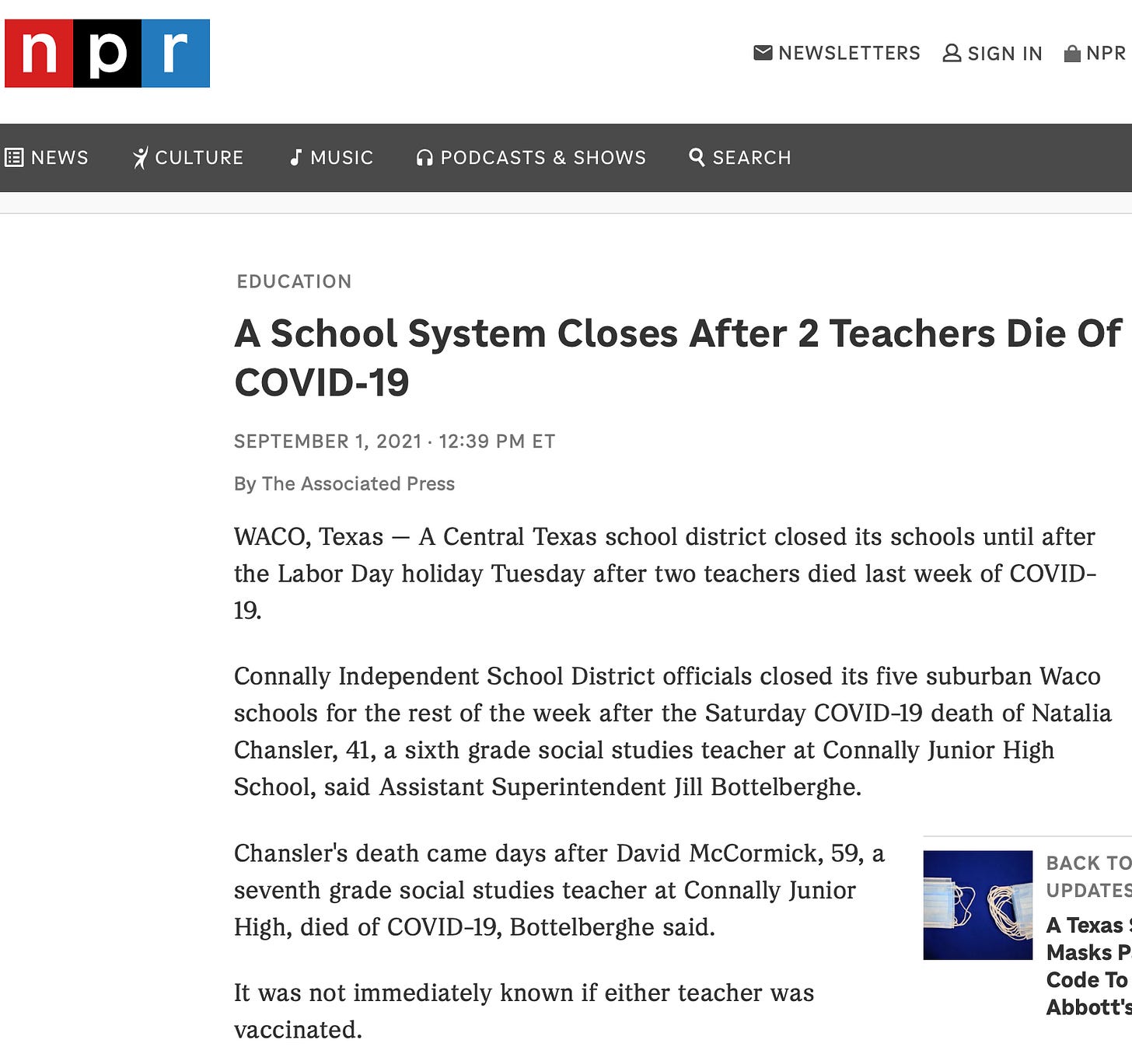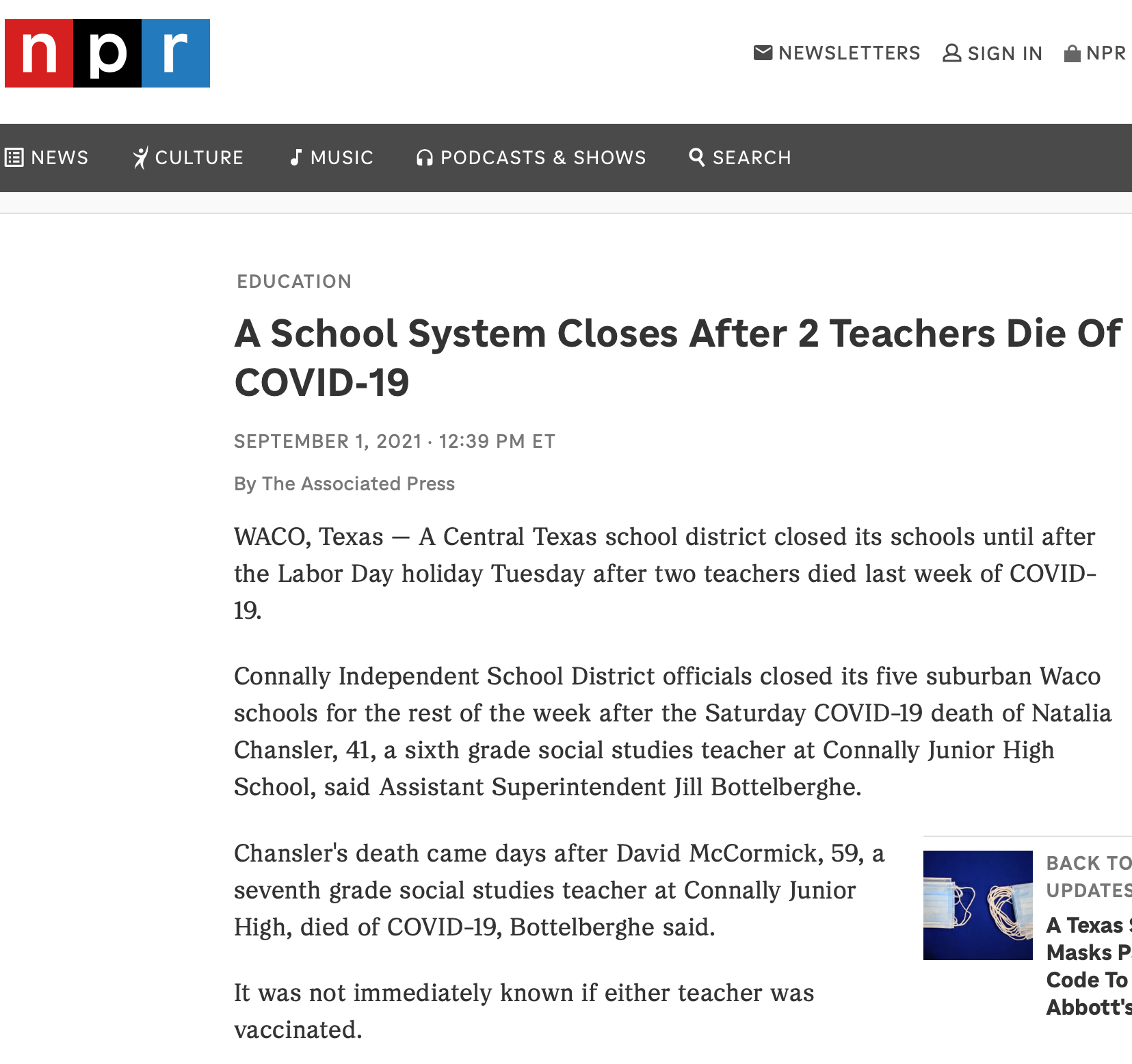 “… Chansler’s death came days after David McCormick, 59, a seventh grade social studies teacher at Connally Junior High, died of COVID-19, Bottelberghe said.