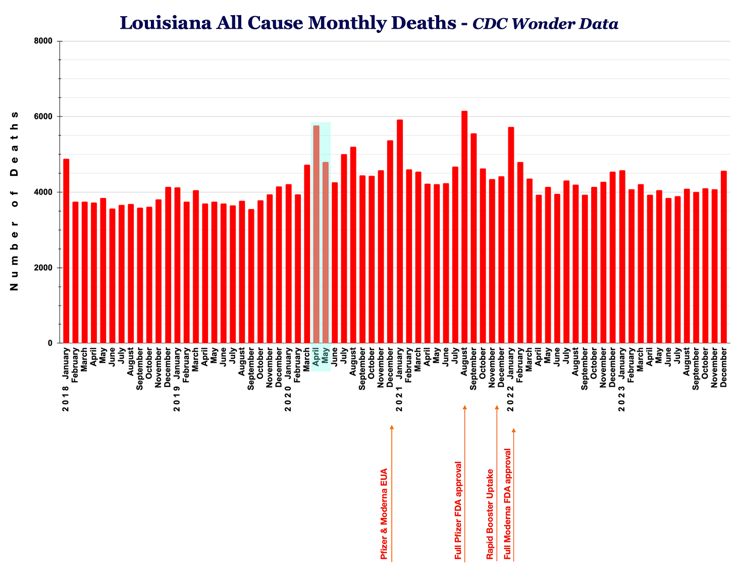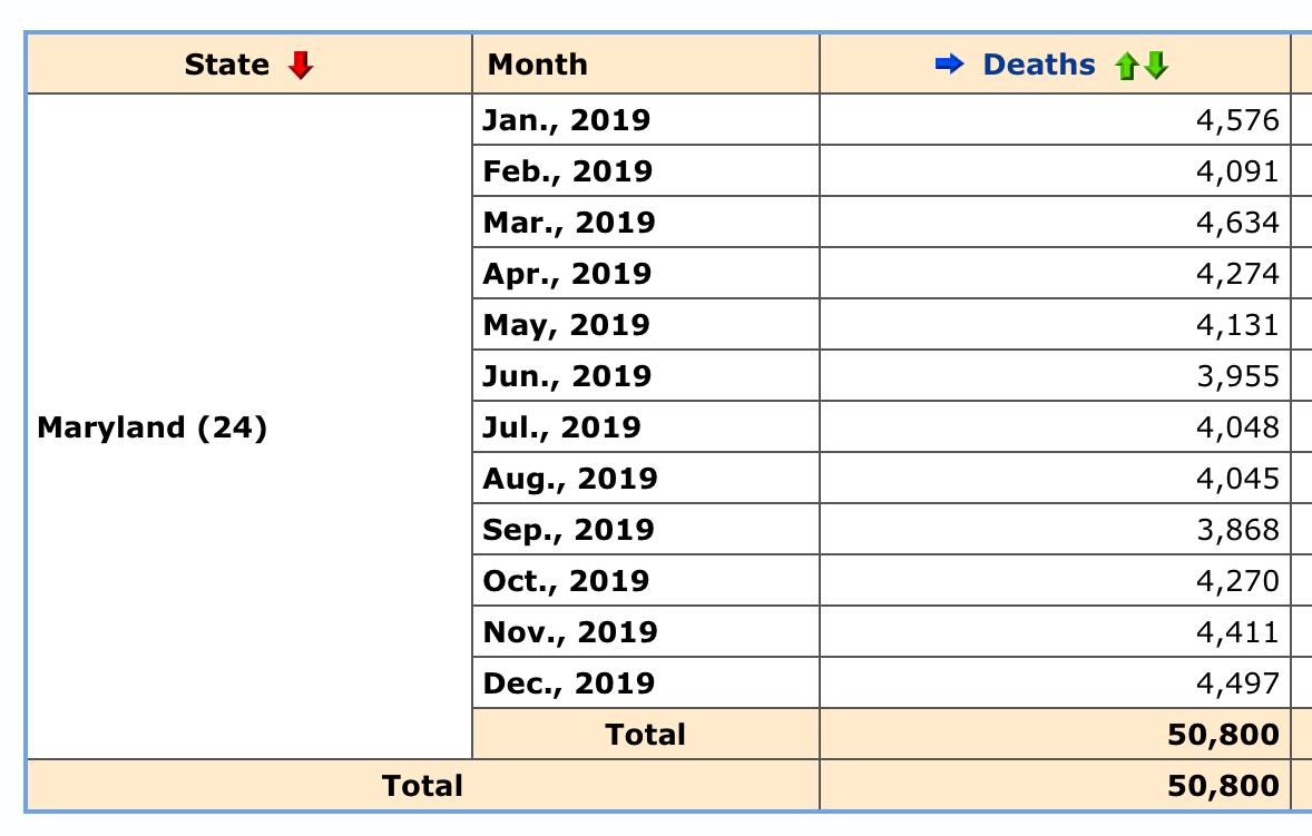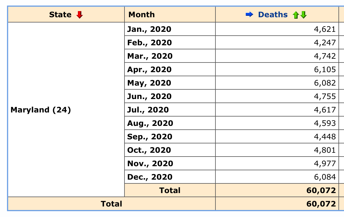 By accident, I noticed another spike showing up … much earlier than the other three elevated bars on the graph. On all three blue state images I made for that last post, there was a consistent bump in the numbers in April/May of 2020. At the time, I mentioned that I was not seeing this same phenomenon in the red state graphs I had previously made.