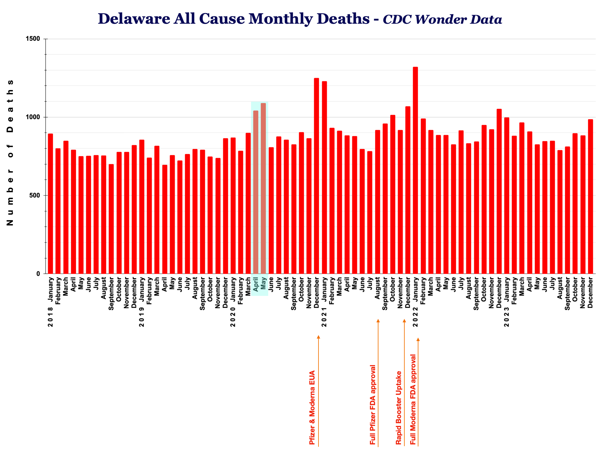 COLORADO, DELAWARE, MARYLAND & NEW YORK (+ guest appearances by INDIANA, LOUISIANA, MICHIGAN & NEW JERSEY ) - All Cause Mortality Data in the Context of the Covid Timeline