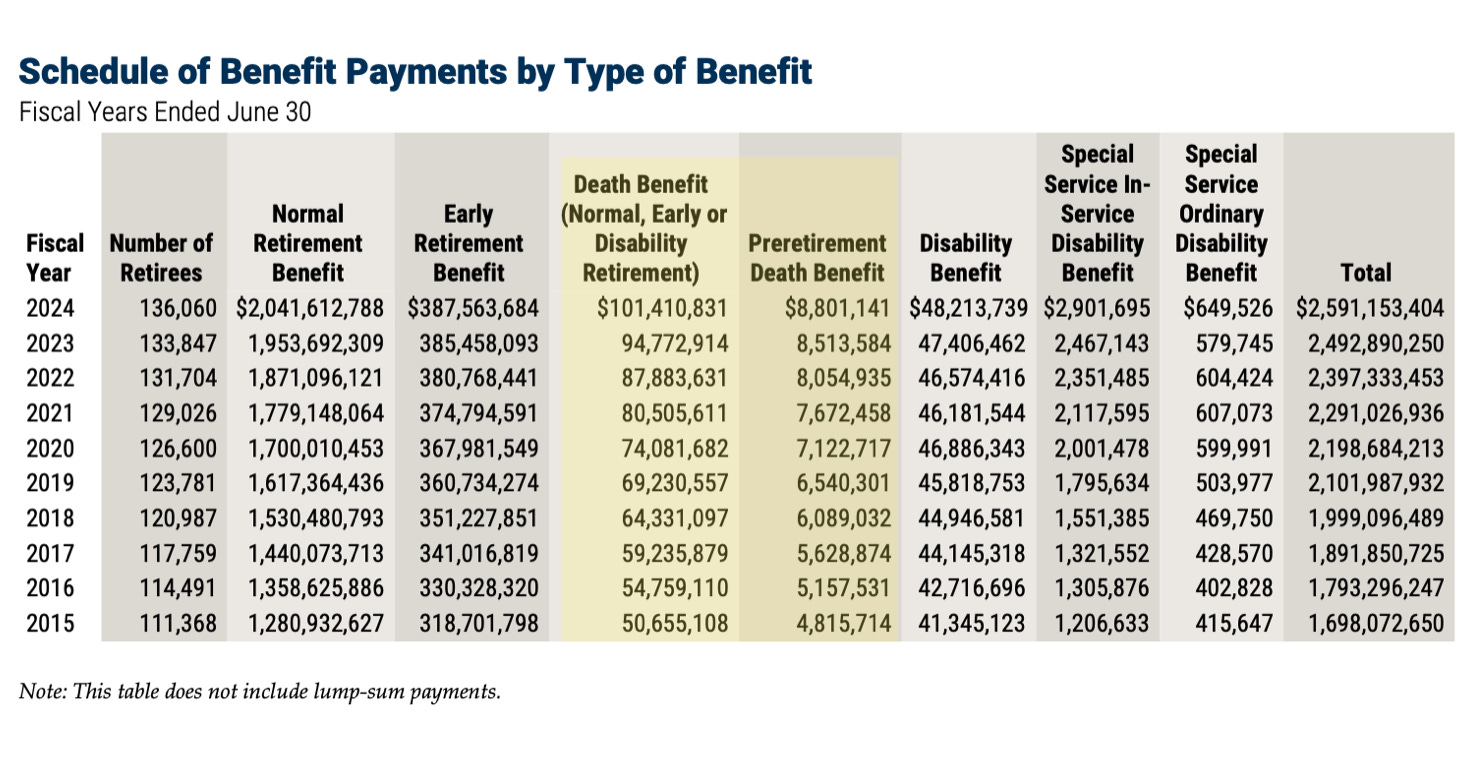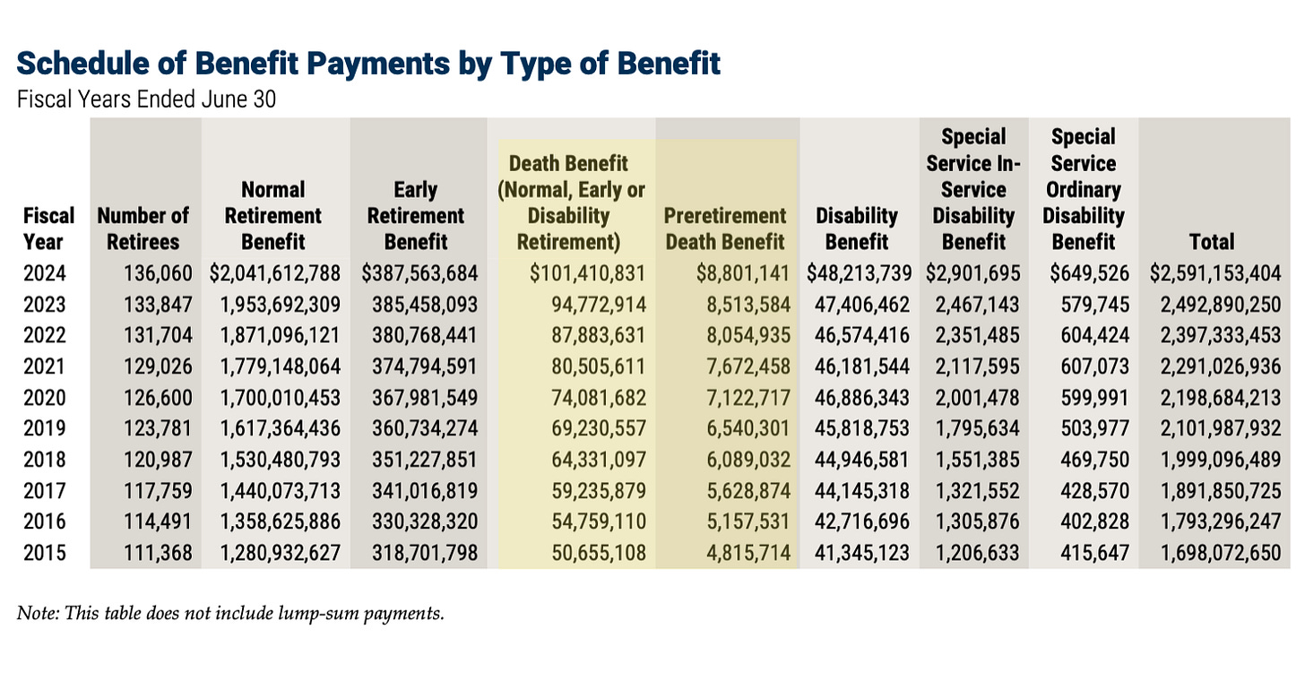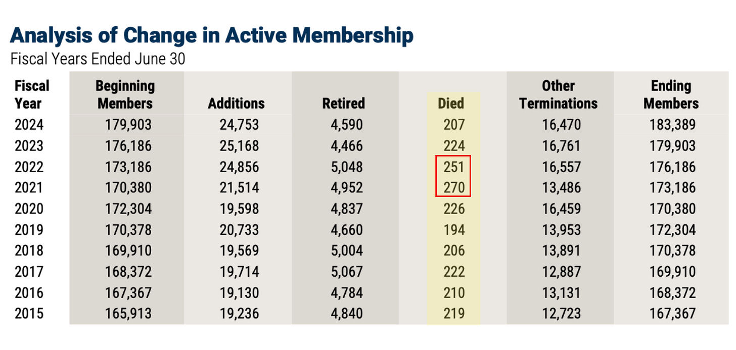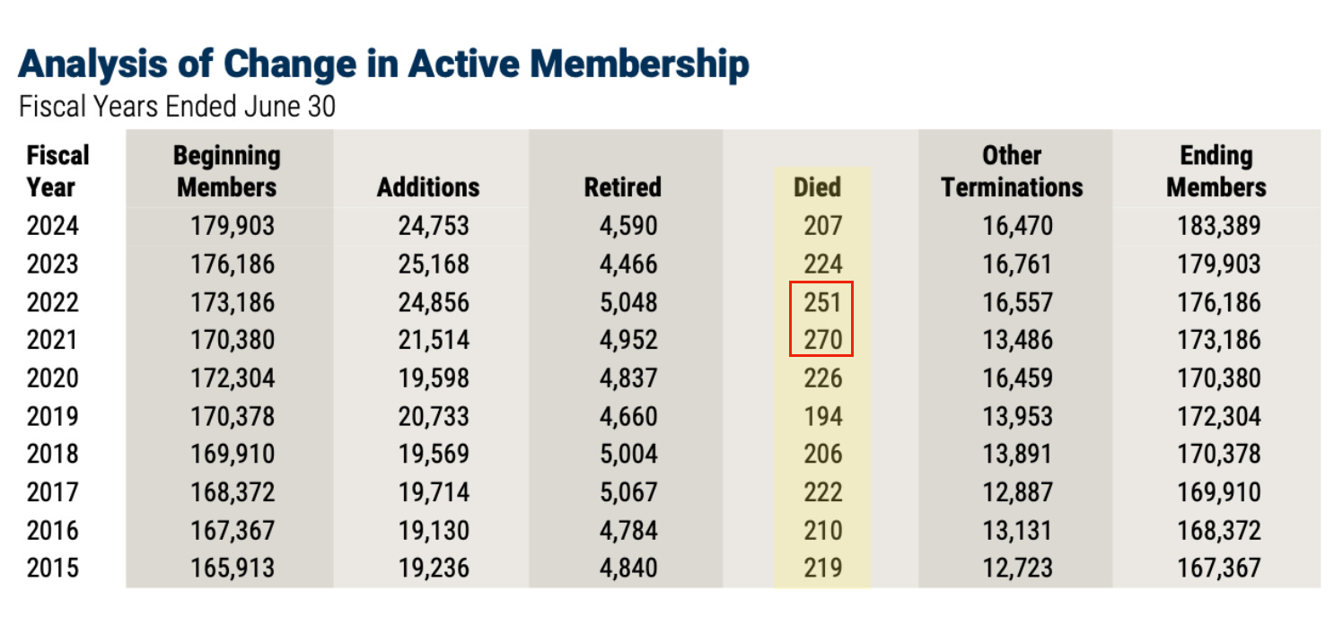 Additional data is included below for active member deaths. That graphic emphasizes two years with the largest numbers, FY2021 and FY2022. This, as we have pointed out before, would point towards younger employees being impacted in that timeframe.