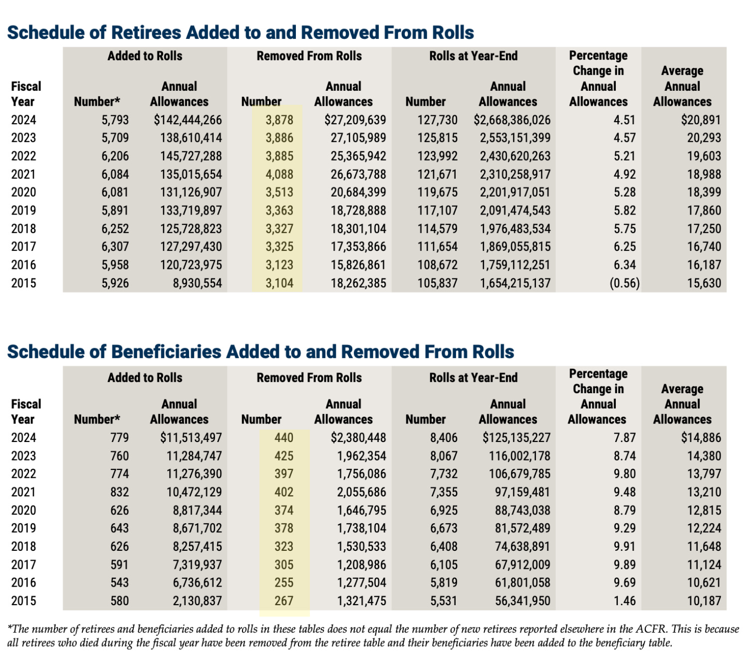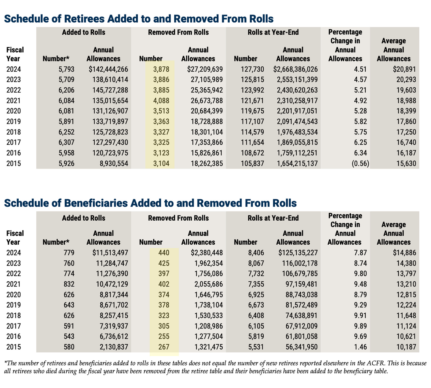 *the following graph combines the numbers from the tables below for retirees and beneficiaries removed.