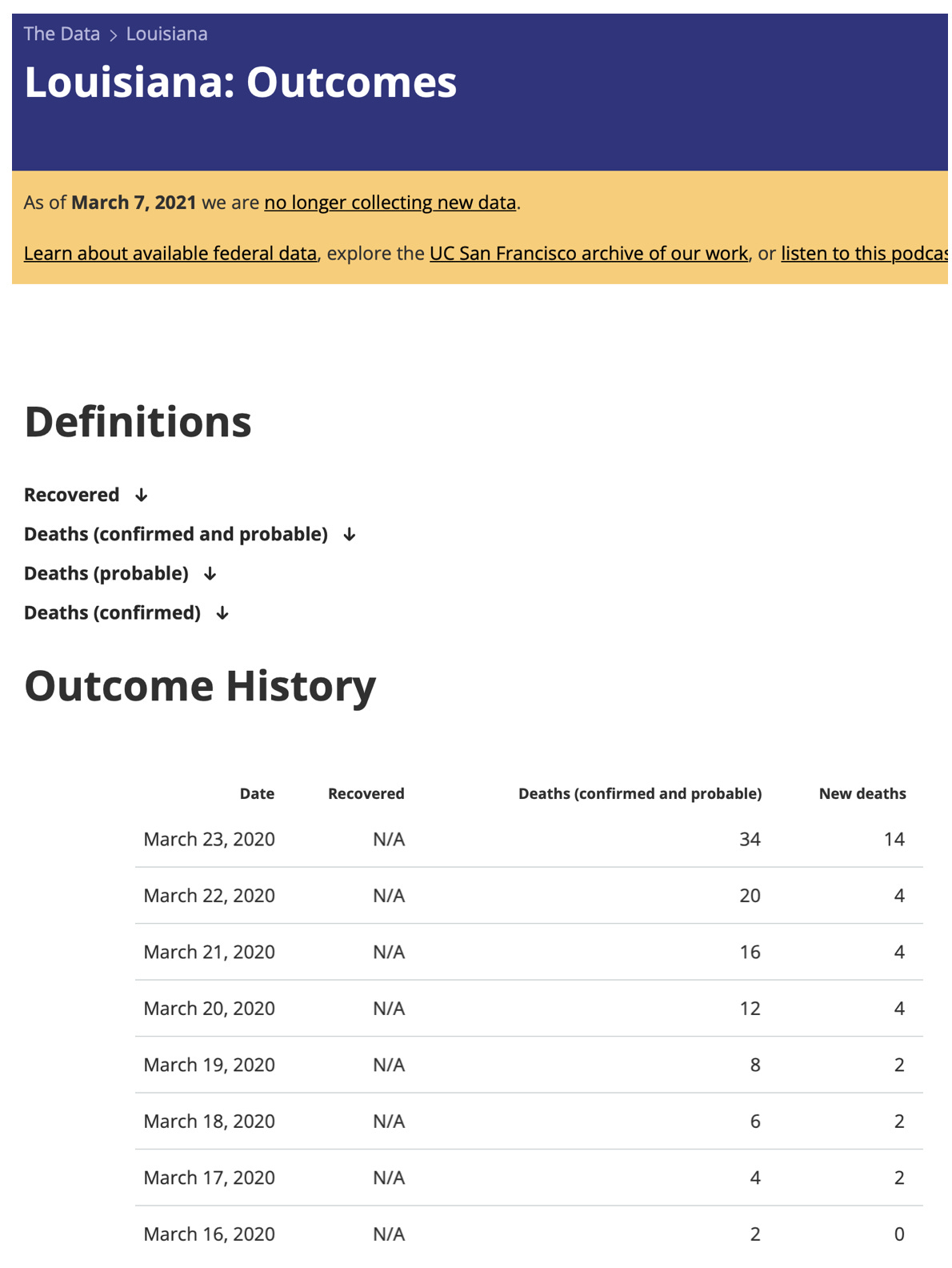 *now this one is more serious in what the numbers look like. If we stick to our reporting lag idea, we are looking at 12 deaths on 3/20. But if we let it go right to the day of the Surgeon General's statement, then it has almost tripled from that twelve. That may have raised a red flag. Okay. But to be thorough, let’s look at the “New deaths” column. 14 of the 34 deaths came on March 23rd itself … how would Jerome have known that while he was busy talking on the Today Show? More than likely, he was basing his Louisiana warning on a “2 to 4 deaths” a day average.