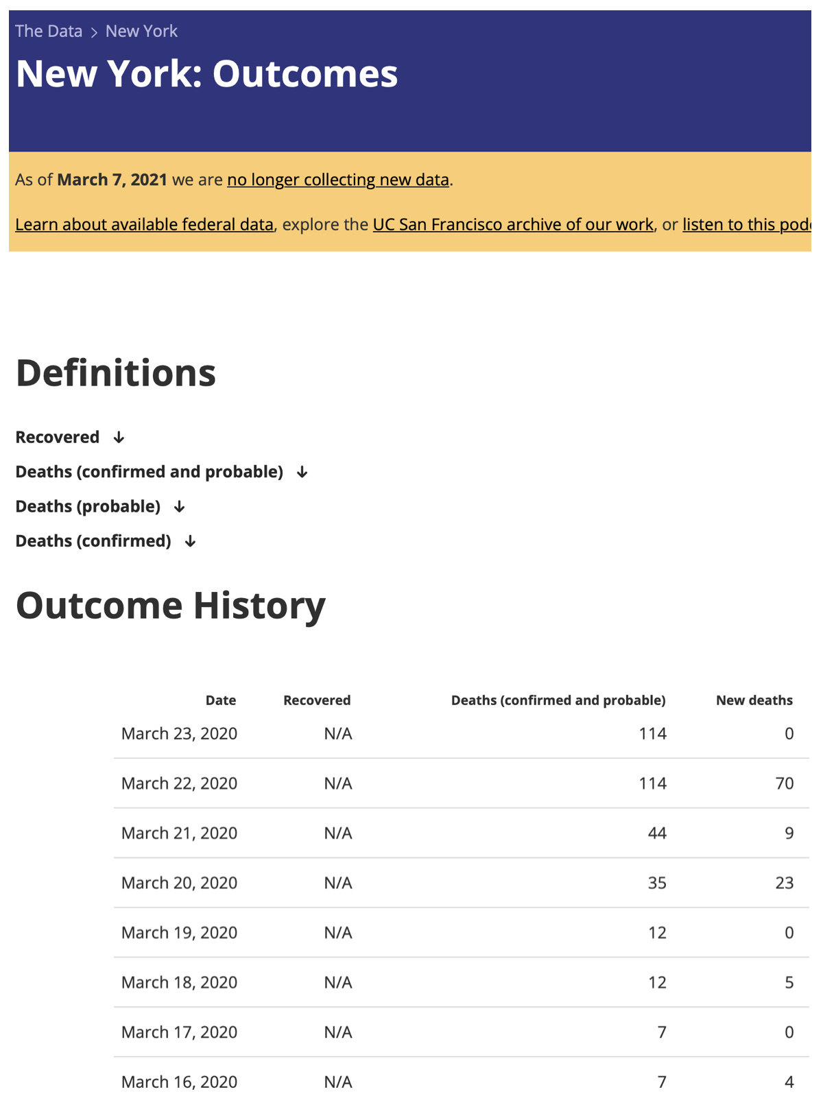 To get to the bottom of that question (or a little closer anyway) we have to consider a couple of things. When a public figure makes a statement on March 23rd, they are likely using data from some days earlier. Especially in the early days of the pandemic there was a delay in reporting, generally known to be around 3 to 7 days. So a reasonable assumption would be that this Jerome’s statements on the Today Show were informed by numbers coming in from the 16th to the 20th, or so.