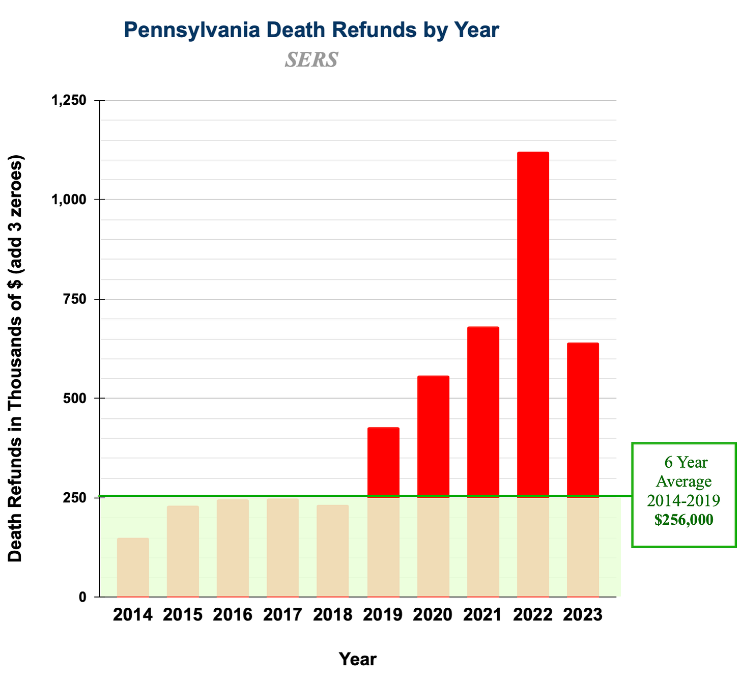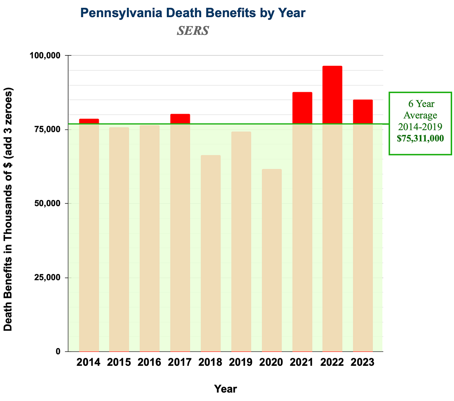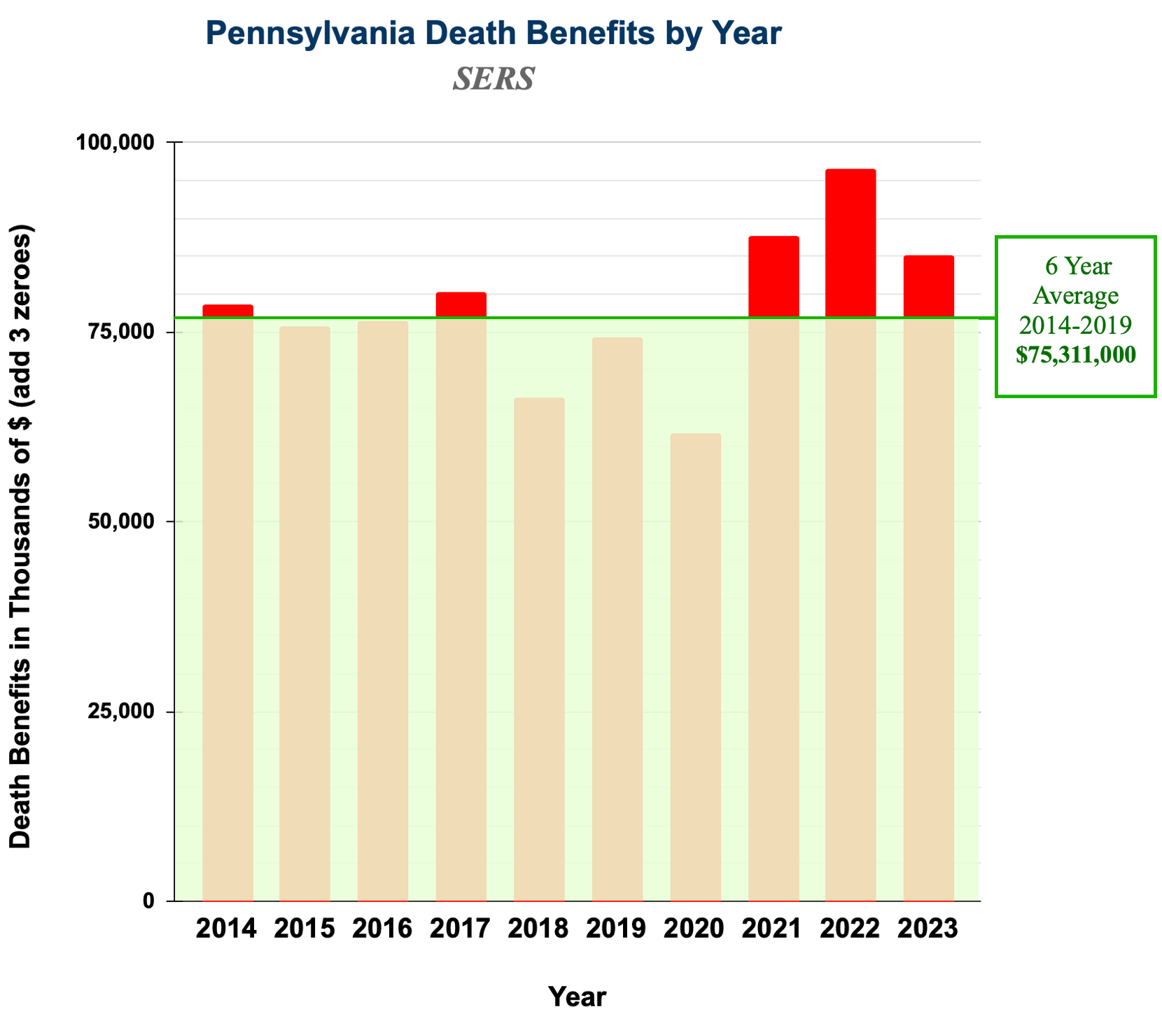 *do keep in mind on the above graph that SERS has a fiscal year ending on December 31st when comparing the mortality in 2020 to 2021. The no vaccine year (2020) had way less death benefits than the first with vaccine year (2021) … and 2022 kept going even higher!