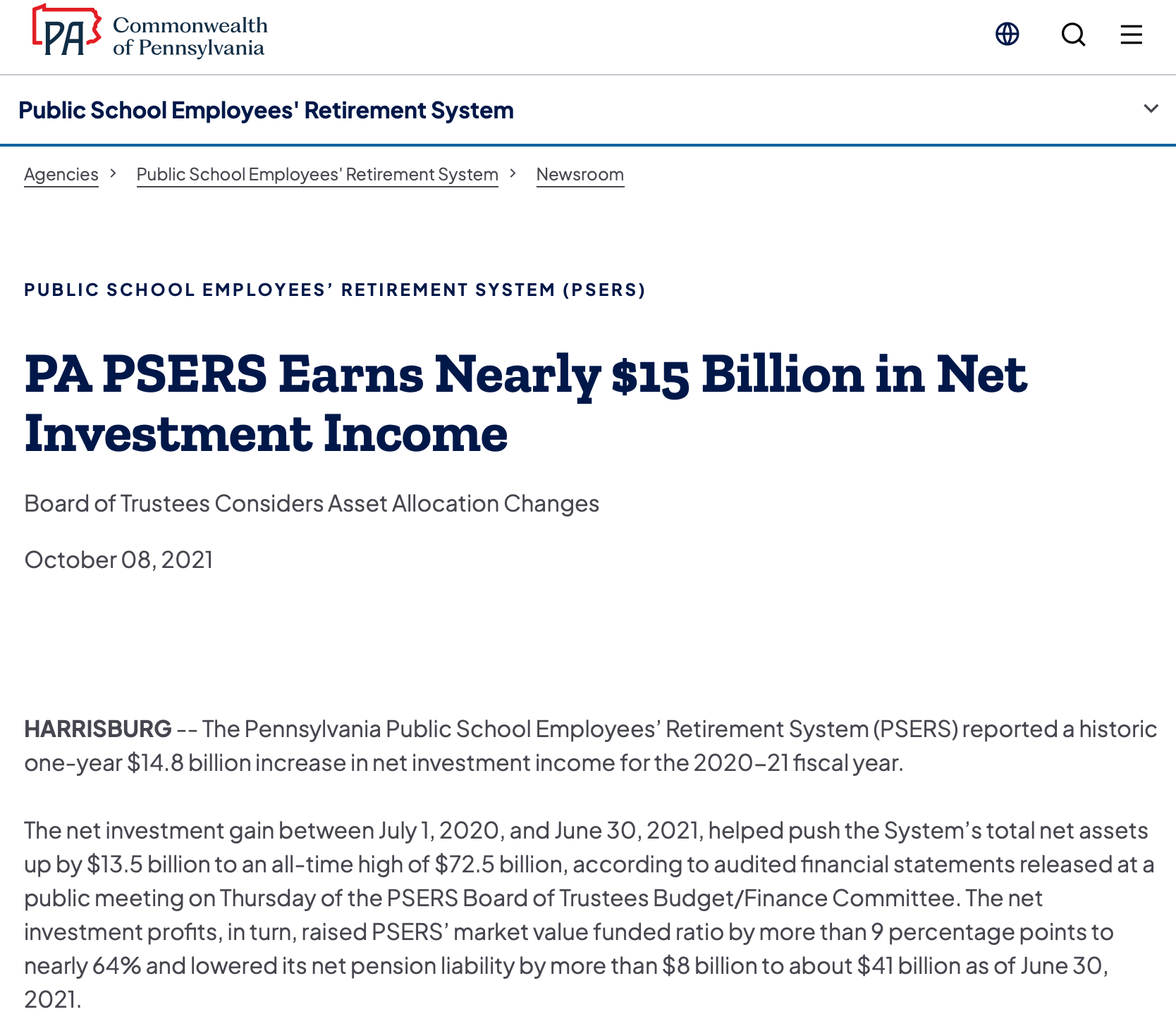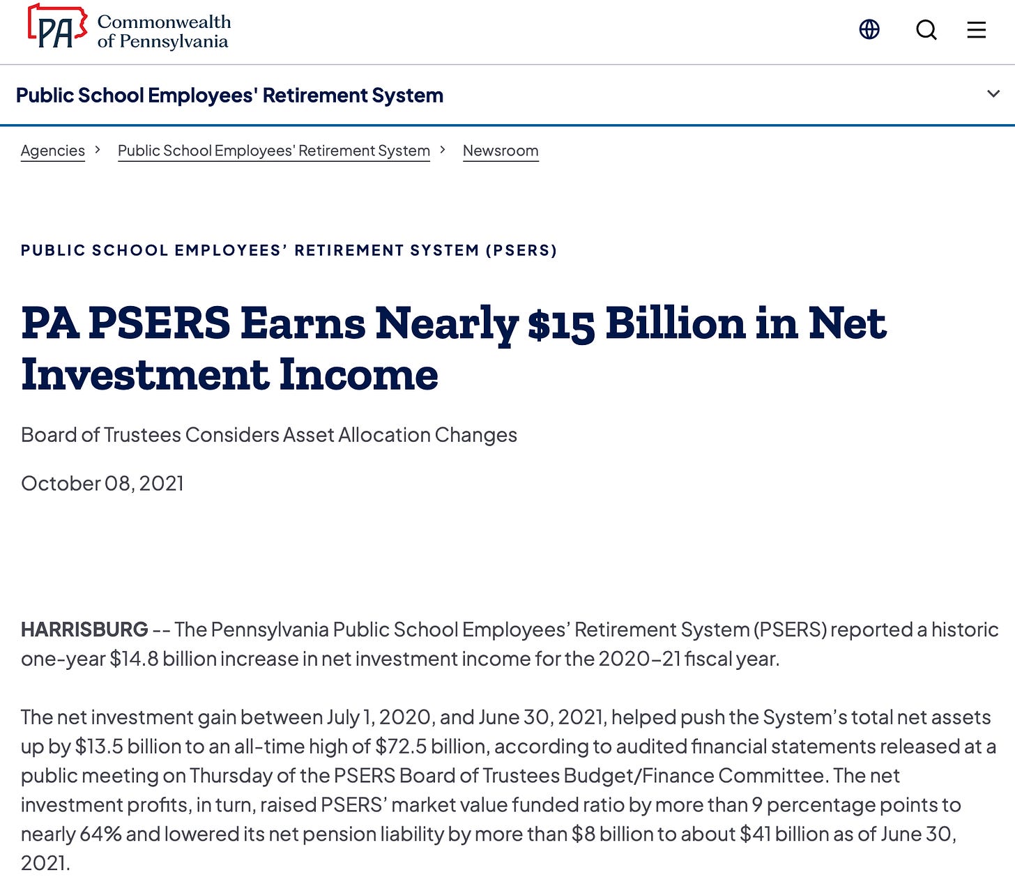 HARRISBURG -- The Pennsylvania Public School Employees’ Retirement System (PSERS) reported a historic one-year $14.8 billion increase in net investment income for the 2020-21 fiscal year.
