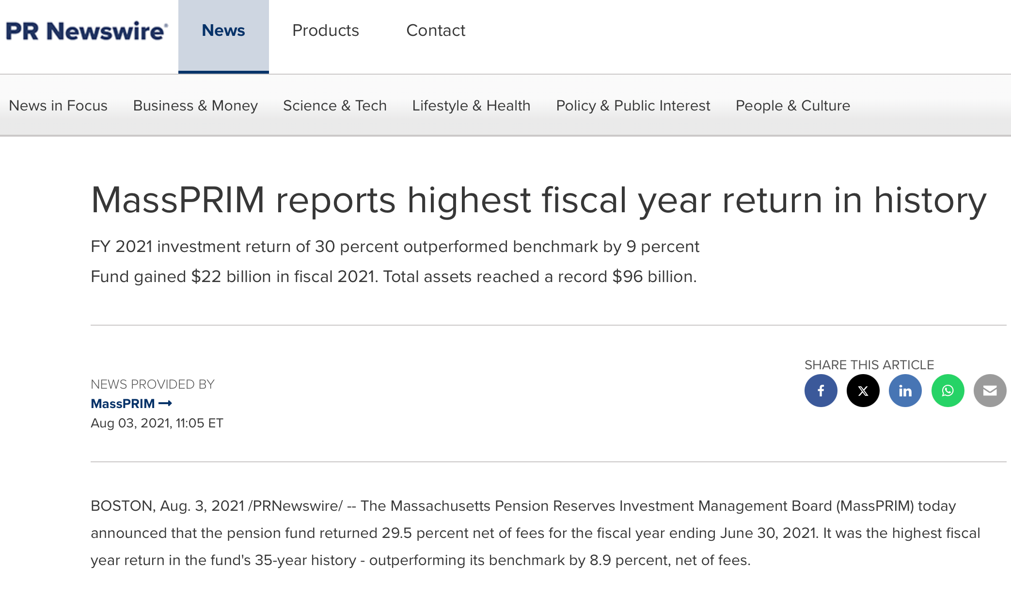 “The Massachusetts Pension Reserves Investment Management Board (MassPRIM) today announced that the pension fund returned 29.5 percent net of fees for the fiscal year ending June 30, 2021. It was the highest fiscal year return in the fund’s 35-year history - outperforming its benchmark by 8.9 percent, net of fees.