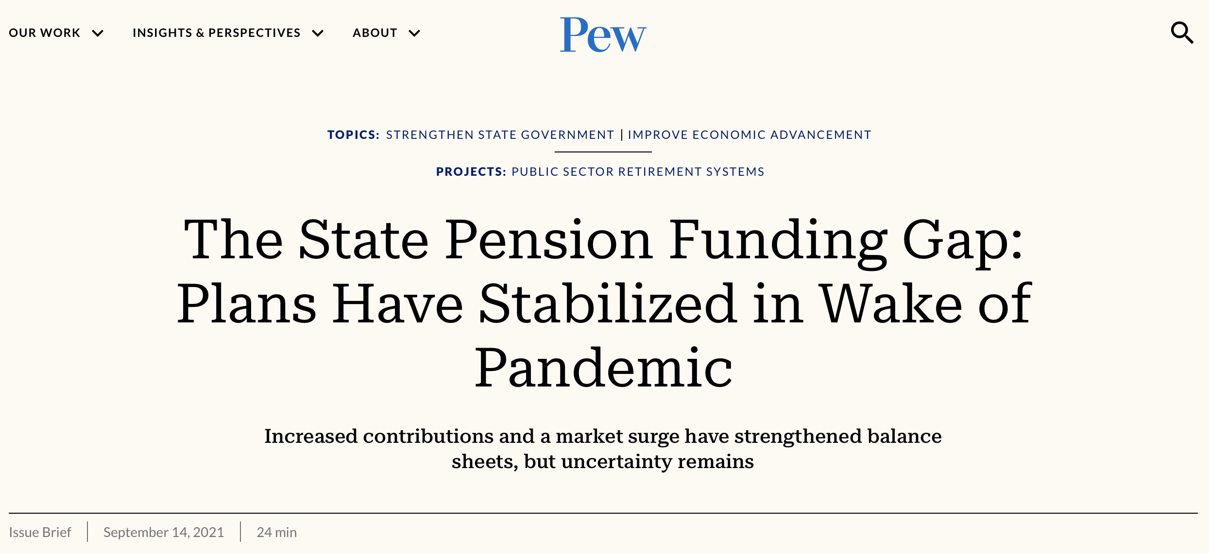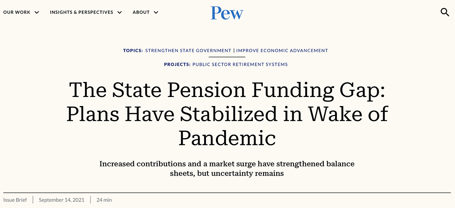“… The nation’s state retirement systems finished the 2021 fiscal year in their best condition since the Great Recession of 2007-09. According to projections by The Pew Charitable Trusts, the gap between the cost of pension benefits that states have promised their workers and what they have set aside to pay for them dropped in 2021 to its lowest level in more than a decade. Pew estimates that state retirement systems are now over 80% funded for the first time since 2008.”