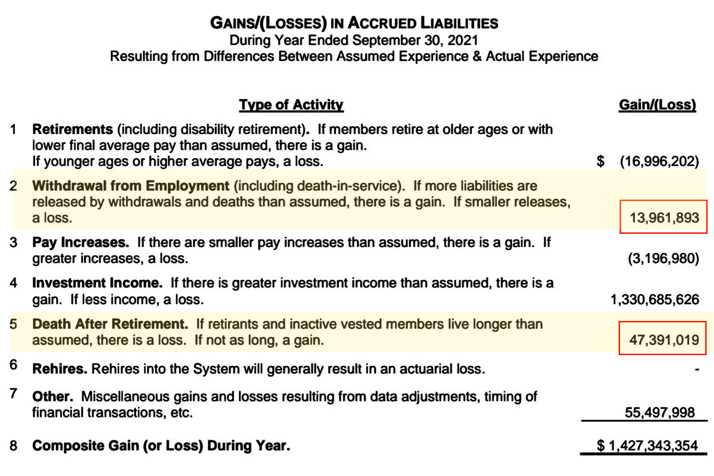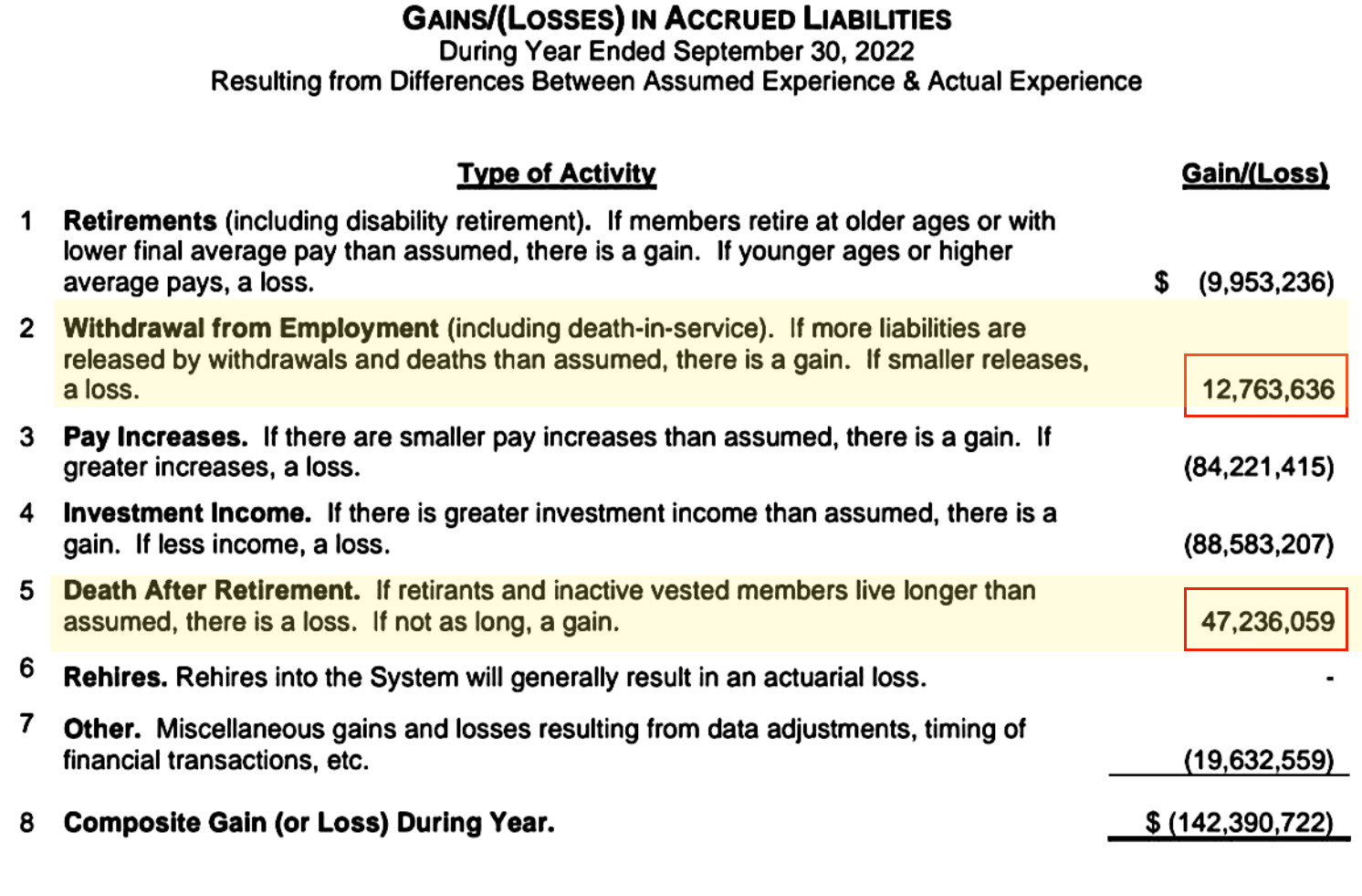 As a reminder, gains on this table have no parentheses around them, but losses do. I originally highlighted “Withdrawal from Employment” because it includes “death in service” numbers in the gain/loss figure. That would translate to employees that died while still working. As you can see by the explanatory sentence for that … “If more liabilities are released by withdrawals and deaths than assumed, there is a gain”.