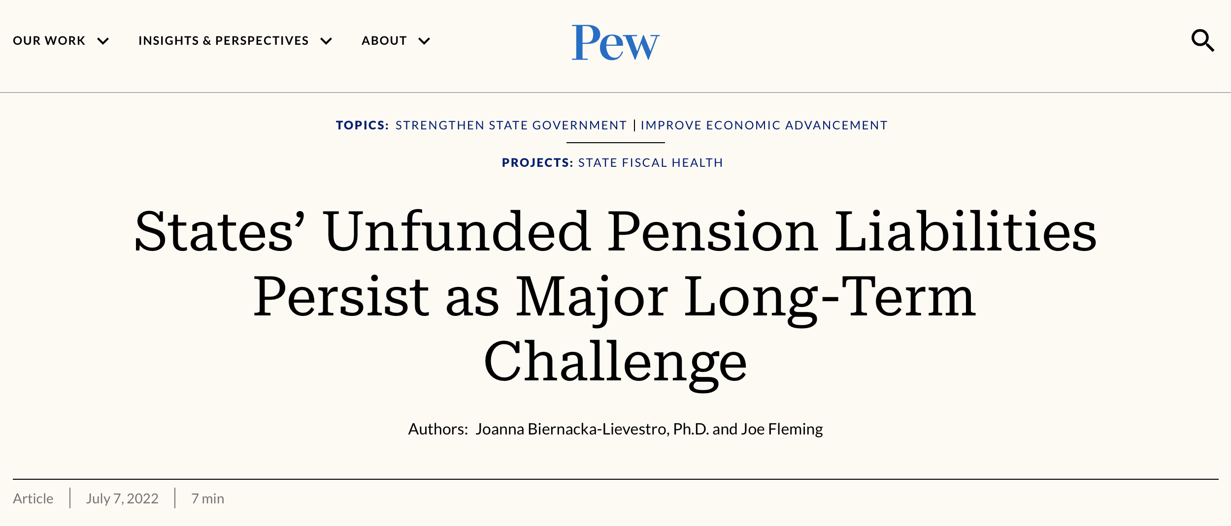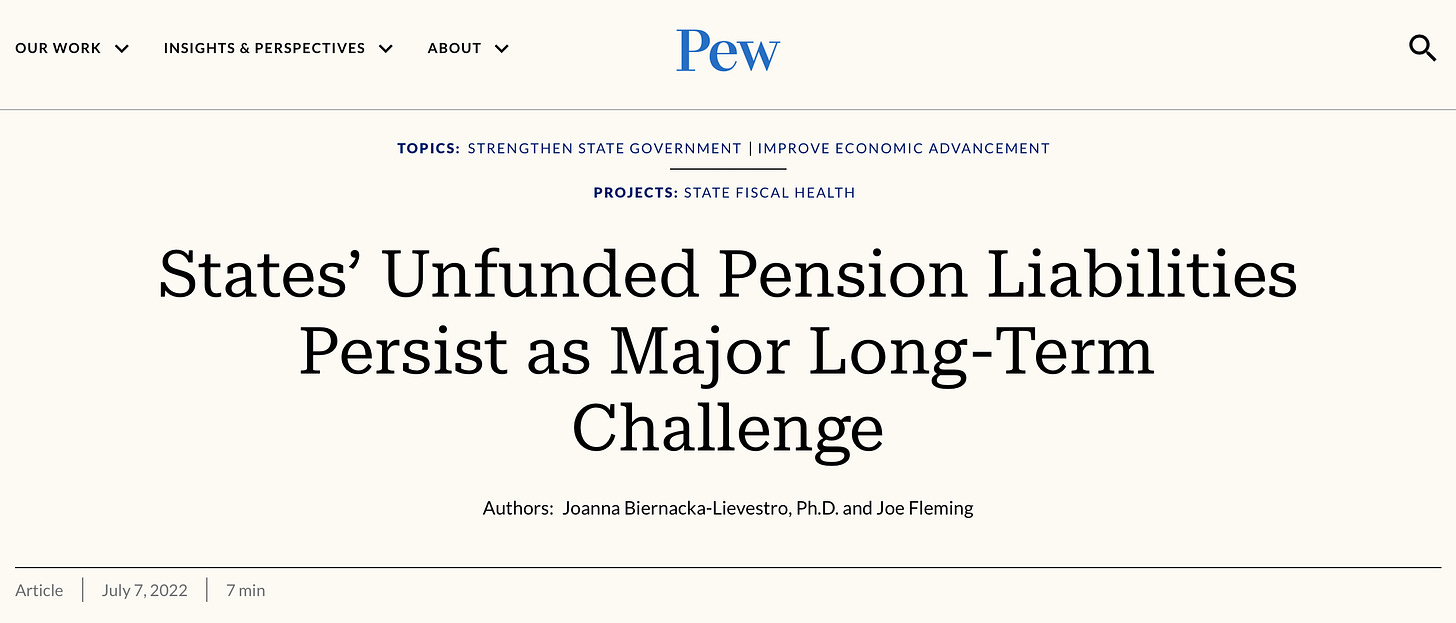 “…For most states, unfunded pension liabilities are the largest of three major long-term obligations weighing on their future finances, ahead of unfunded retiree health care benefits for public employees and outstanding debt. Although still sizable, the gap between what states collectively have set aside and what they owe in public pension benefits narrowed after financial markets surged in fiscal year 2021, according to Pew projections.