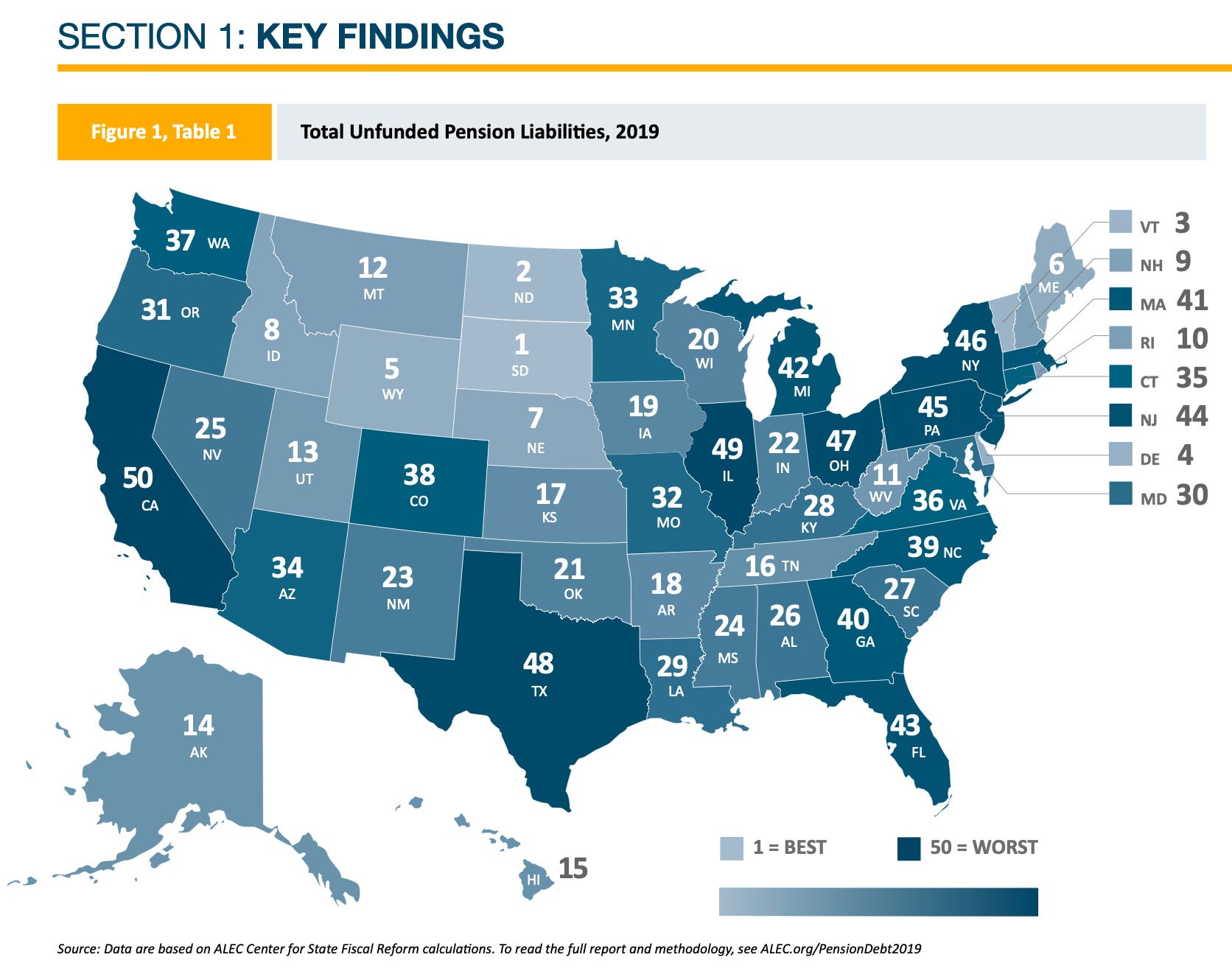 Notice the color scale for Best to Worst at the bottom right. This is a map of how the states rank for Unfunded Pension Liabilities in 2019. The darker the color on the map, the worst shape you are in. (Our friends in Michigan were in the bottom ten).